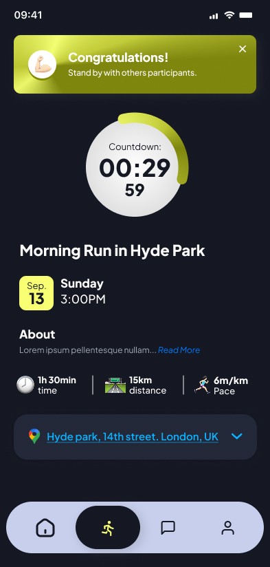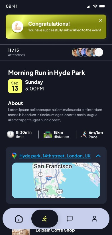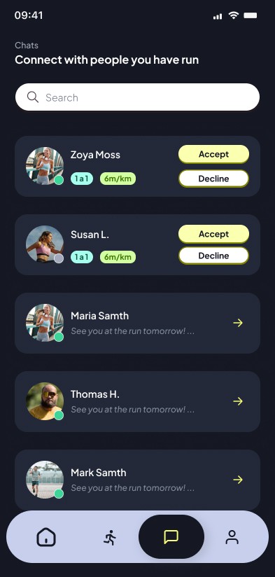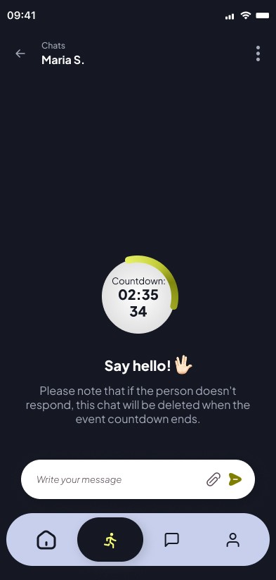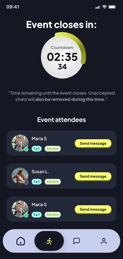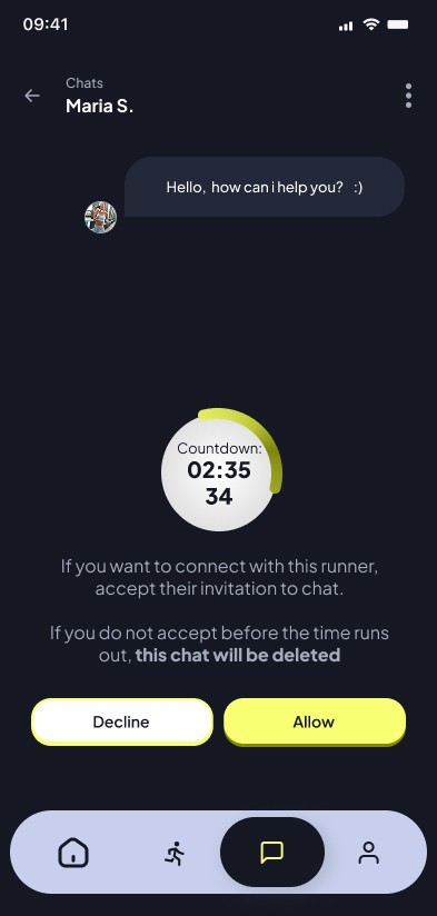 To boost LTV (Lifetime Value), I implemented a post-event strategy where the app facilitates networking. Once the run ends, a window of opportunity opens to start a chat with other verified runners, transforming an isolated physical activity into a recurring community habit.