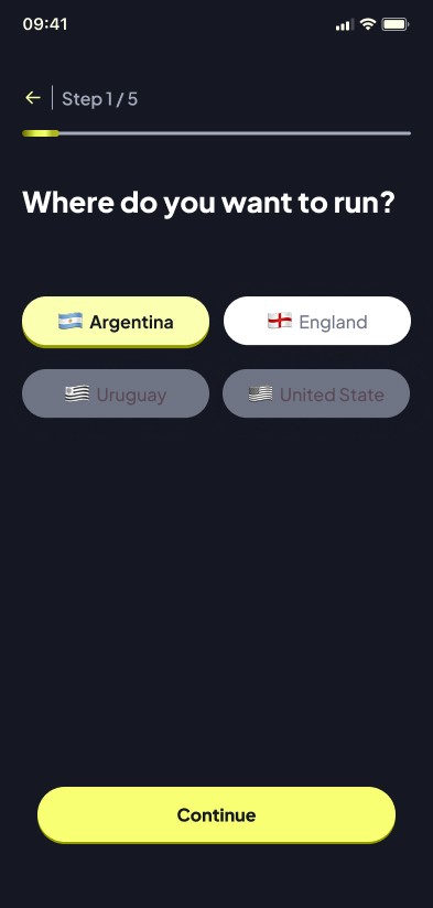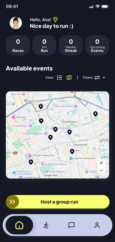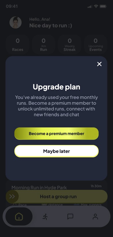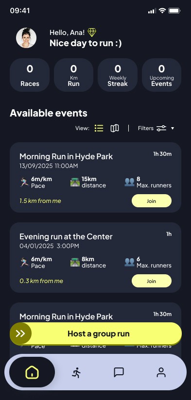The core challenge was designing a scalable MVP based on a Freemium model. I had to structure a seamless experience that balanced free access (2 runs/month) with clear incentives for the premium subscription (unlimited runs and user-led event creation). Since there were no prior visual assets or design systems, the goal was to build a robust functional interface that would define the brand's aesthetic DNA directly through the product's UI.